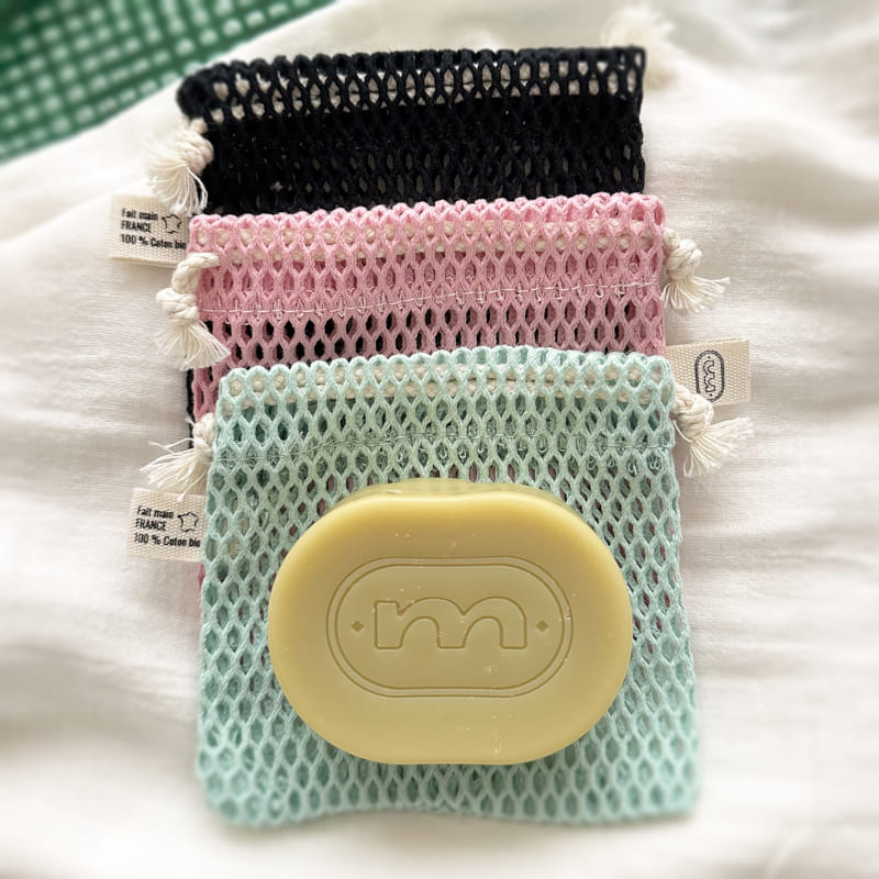 Ανακαλύψτε το πλεκτό πουγκί σαπουνιού από οργανικό βαμβάκι XL, κατασκευασμένο στη Γαλλία με σεβασμό στην κοινωνική και αλληλέγγυα οικονομία (ESAT). Το πουγκί σας επιτρέπει να χρησιμοποιείτε σαπούνια ή σαμπουάν σε μπάρα μέχρι την τελευταία χρήση, παρέχοντας εξαιρετικό αφρό και απαλή απολέπιση.